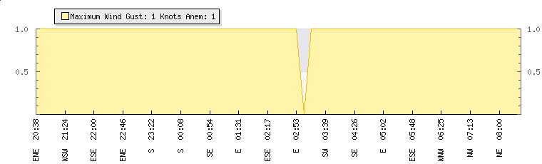 In the last few minutes the wind was Northerly at an average speed of 1 knots, reaching up to 1 knots and a low of 0 knots. The gust strength is1 knots above the minimum speed |
