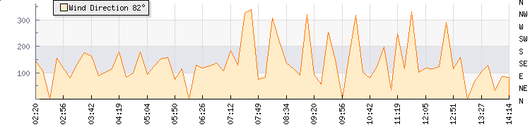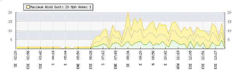 In the last few minutes the wind was East South East at an average speed of 4 mph, reaching up to 7 mph and a low of 2 mph. The gust strength is5 mph above the minimum speed |
