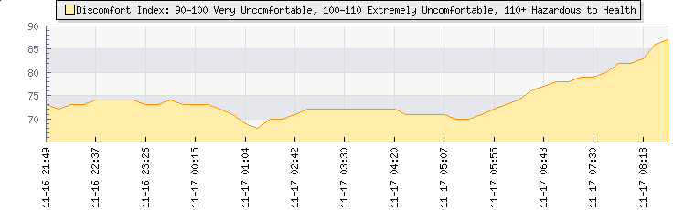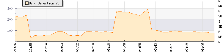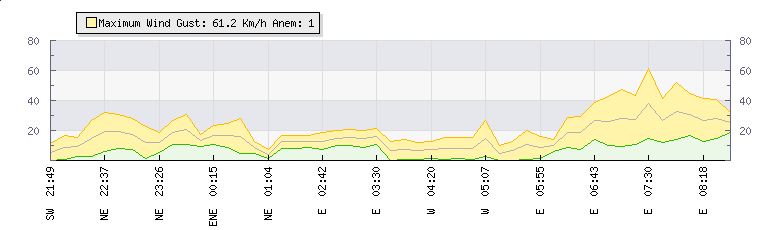 In the last few minutes the wind was Easterly at an average speed of 38 kmh, reaching up to 61 kmh and a low of 15 kmh. The gust strength is46 kmh above the minimum speed |