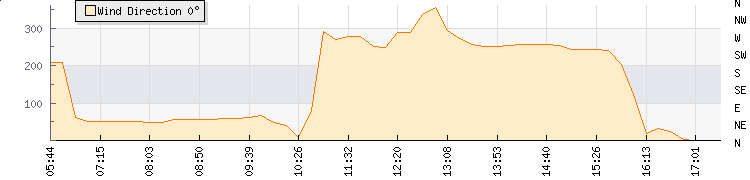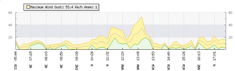 In the last few minutes the wind was South South West at an average speed of 11 kmh, reaching up to 15 kmh and a low of 6 kmh. The gust strength is9 kmh above the minimum speed |