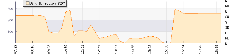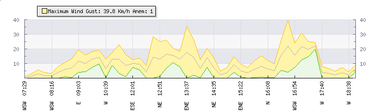 In the last few minutes the wind was West South West at an average speed of 2 kmh, reaching up to 5 kmh and a low of 0 kmh. The gust strength is5 kmh above the minimum speed |