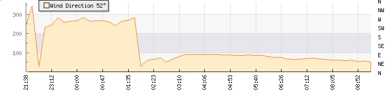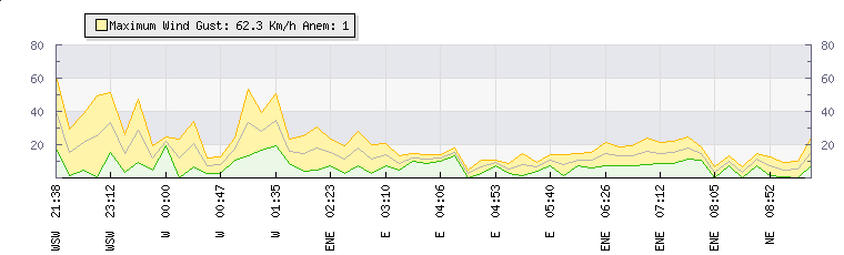 In the last few minutes the wind was East North East at an average speed of 16 kmh, reaching up to 22 kmh and a low of 9 kmh. The gust strength is13 kmh above the minimum speed |