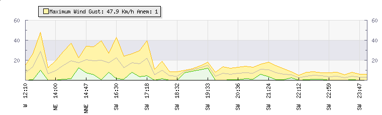 In the last few minutes the wind was North Easterly at an average speed of 10 kmh, reaching up to 19 kmh and a low of 0 kmh. The gust strength is19 kmh above the minimum speed |