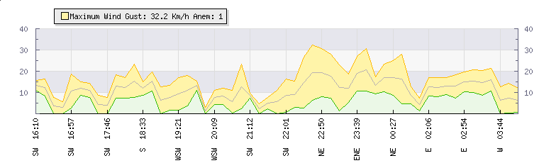 In the last few minutes the wind was North Easterly at an average speed of 4 kmh, reaching up to 7 kmh and a low of 1 kmh. The gust strength is6 kmh above the minimum speed |