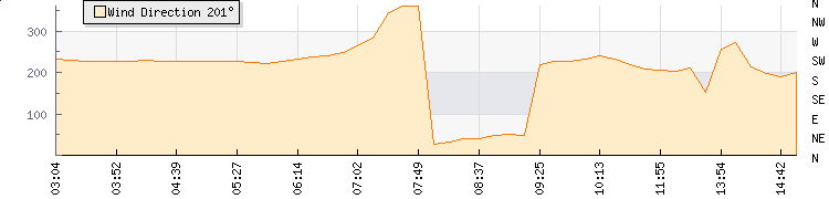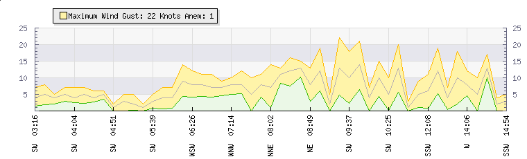 In the last few minutes the wind was South South West at an average speed of 6 knots, reaching up to 11 knots and a low of 1 knots. The gust strength is10 knots above the minimum speed |