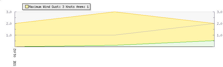 In the last few minutes the wind was Southerly at an average speed of 2 knots, reaching up to 2 knots and a low of 1 knots. The gust strength is1 knots above the minimum speed |