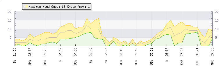In the last few minutes the wind was East North East at an average speed of 10 knots, reaching up to 12 knots and a low of 7 knots. The gust strength is5 knots above the minimum speed |