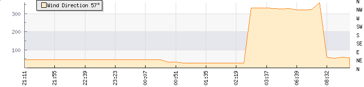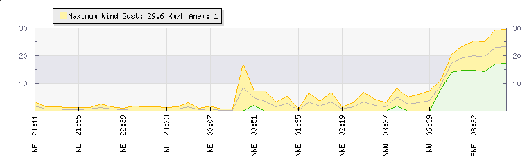 In the last few minutes the wind was North Westerly at an average speed of 9 kmh, reaching up to 11 kmh and a low of 8 kmh. The gust strength is3 kmh above the minimum speed |