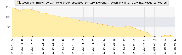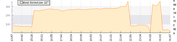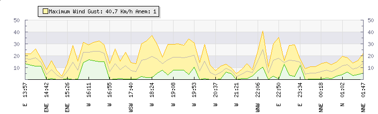 In the last few minutes the wind was North Westerly at an average speed of 7 kmh, reaching up to 12 kmh and a low of 1 kmh. The gust strength is11 kmh above the minimum speed |