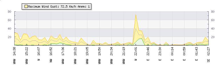 In the last few minutes the wind was Easterly at an average speed of 3 kmh, reaching up to 6 kmh and a low of 1 kmh. The gust strength is5 kmh above the minimum speed |