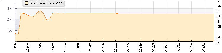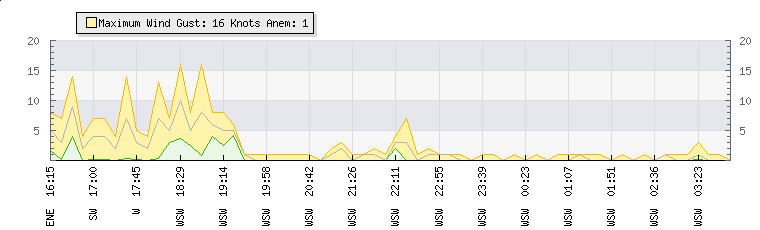 In the last few minutes the wind was West South West at an average speed of 0 knots, reaching up to 0 knots and a low of 0 knots. The gust strength is0 knots above the minimum speed |