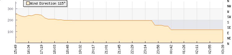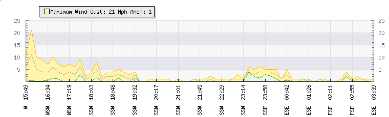 In the last few minutes the wind was East South East at an average speed of 0 mph, reaching up to 0 mph and a low of 0 mph. The gust strength is0 mph above the minimum speed |