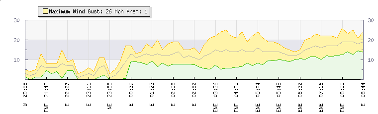 In the last few minutes the wind was East North East at an average speed of 13 mph, reaching up to 15 mph and a low of 11 mph. The gust strength is4 mph above the minimum speed |