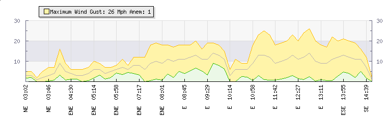 In the last few minutes the wind was Easterly at an average speed of 13 mph, reaching up to 23 mph and a low of 3 mph. The gust strength is20 mph above the minimum speed |