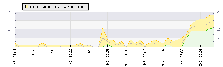 In the last few minutes the wind was North Westerly at an average speed of 6 mph, reaching up to 7 mph and a low of 5 mph. The gust strength is2 mph above the minimum speed |