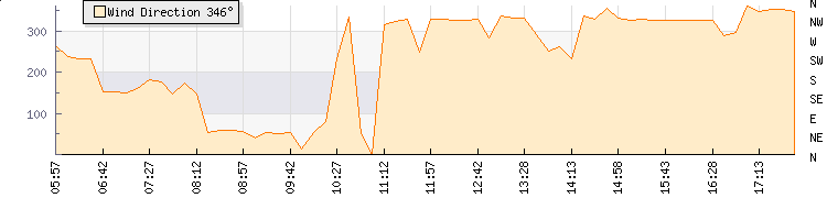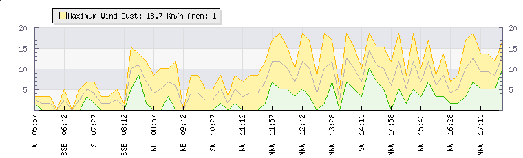In the last few minutes the wind was North Westerly at an average speed of 4 kmh, reaching up to 7 kmh and a low of 2 kmh. The gust strength is5 kmh above the minimum speed |