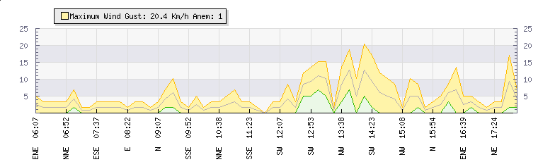 In the last few minutes the wind was North North East at an average speed of 1 kmh, reaching up to 2 kmh and a low of 0 kmh. The gust strength is2 kmh above the minimum speed |