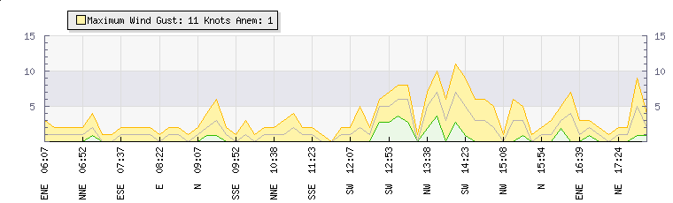 In the last few minutes the wind was North Westerly at an average speed of 3 knots, reaching up to 5 knots and a low of 1 knots. The gust strength is4 knots above the minimum speed |