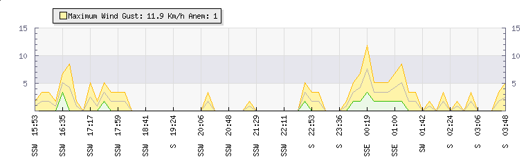 In the last few minutes the wind was South South East at an average speed of 5 kmh, reaching up to 10 kmh and a low of 0 kmh. The gust strength is10 kmh above the minimum speed |