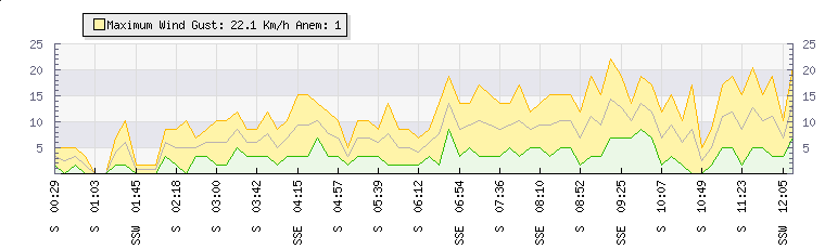 In the last few minutes the wind was Southerly at an average speed of 6 kmh, reaching up to 10 kmh and a low of 2 kmh. The gust strength is8 kmh above the minimum speed |
