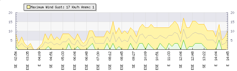 In the last few minutes the wind was South Easterly at an average speed of 5 kmh, reaching up to 10 kmh and a low of 0 kmh. The gust strength is10 kmh above the minimum speed |