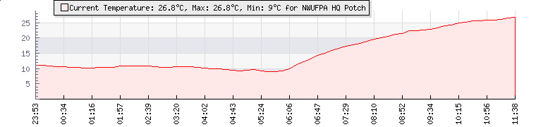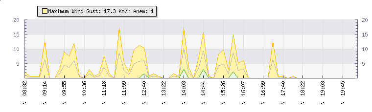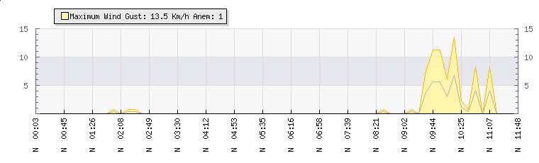 In the last few minutes the wind was Northerly at an average speed of 9 kmh, reaching up to 15 kmh and a low of 2 kmh. The gust strength is13 kmh above the minimum speed |