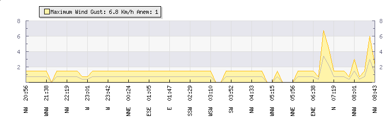 In the last few minutes the wind was North North East at an average speed of 1 kmh, reaching up to 1 kmh and a low of 0 kmh. The gust strength is1 kmh above the minimum speed |