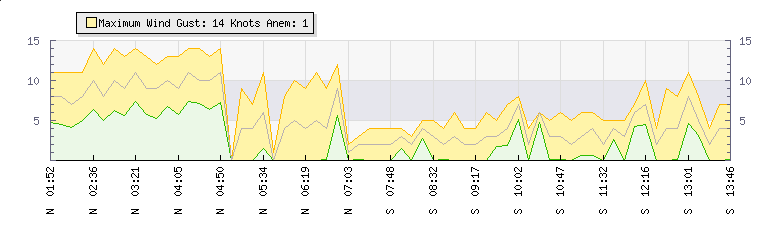 In the last few minutes the wind was Southerly at an average speed of 7 knots, reaching up to 10 knots and a low of 5 knots. The gust strength is5 knots above the minimum speed |