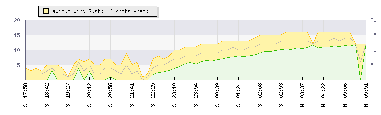 In the last few minutes the wind was Northerly at an average speed of 13 knots, reaching up to 16 knots and a low of 11 knots. The gust strength is5 knots above the minimum speed |