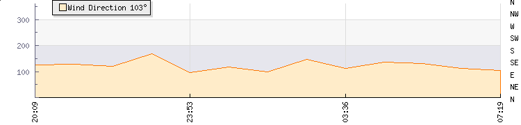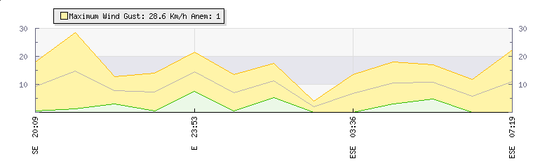 In the last few minutes the wind was South Easterly at an average speed of 11 kmh, reaching up to 17 kmh and a low of 5 kmh. The gust strength is12 kmh above the minimum speed |