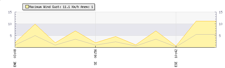 In the last few minutes the wind was South Easterly at an average speed of 1 kmh, reaching up to 2 kmh and a low of 0 kmh. The gust strength is2 kmh above the minimum speed |