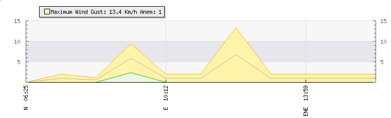In the last few minutes the wind was North North East at an average speed of 1 kmh, reaching up to 2 kmh and a low of 0 kmh. The gust strength is2 kmh above the minimum speed |