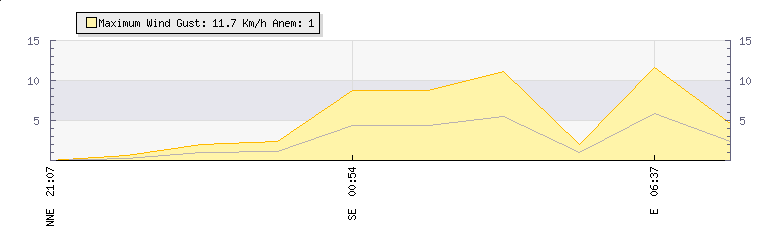 In the last few minutes the wind was Easterly at an average speed of 6 kmh, reaching up to 12 kmh and a low of 0 kmh. The gust strength is12 kmh above the minimum speed |
