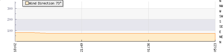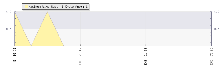 In the last few minutes the wind was East North East at an average speed of 0 knots, reaching up to 0 knots and a low of 0 knots. The gust strength is0 knots above the minimum speed |
