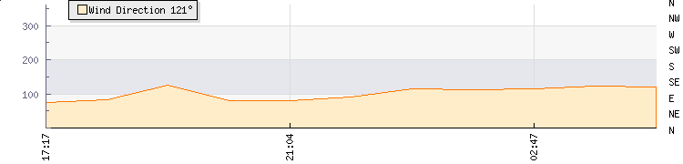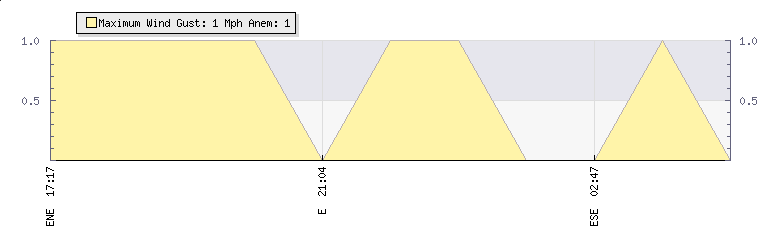 In the last few minutes the wind was East South East at an average speed of 0 mph, reaching up to 0 mph and a low of 0 mph. The gust strength is0 mph above the minimum speed |