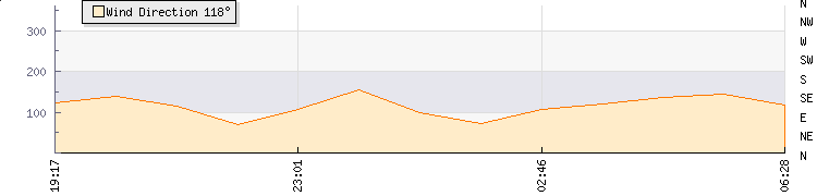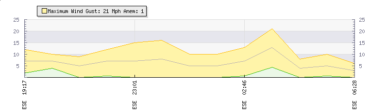 In the last few minutes the wind was East South East at an average speed of 13 mph, reaching up to 21 mph and a low of 4 mph. The gust strength is17 mph above the minimum speed |