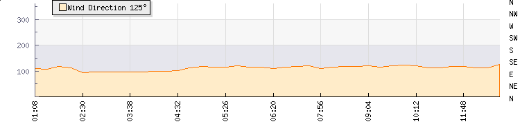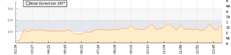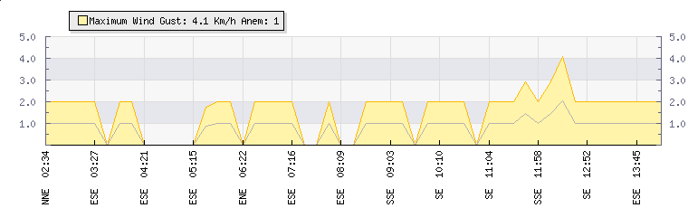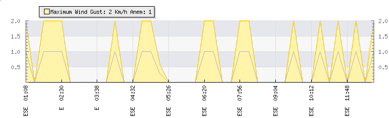 In the last few minutes the wind was East South East at an average speed of 1 kmh, reaching up to 2 kmh and a low of 0 kmh. The gust strength is2 kmh above the minimum speed |