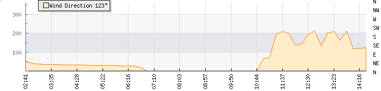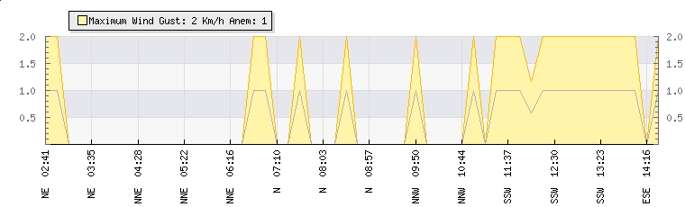 In the last few minutes the wind was South Easterly at an average speed of 1 kmh, reaching up to 2 kmh and a low of 0 kmh. The gust strength is2 kmh above the minimum speed |