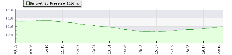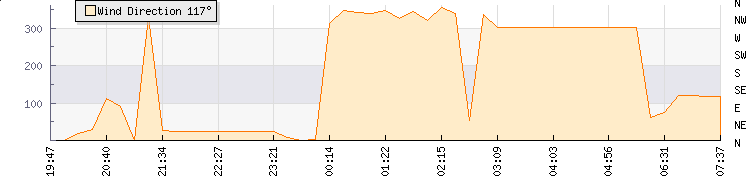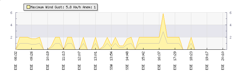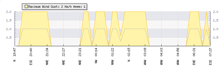 In the last few minutes the wind was West North West at an average speed of 0 kmh, reaching up to 0 kmh and a low of 0 kmh. The gust strength is0 kmh above the minimum speed |