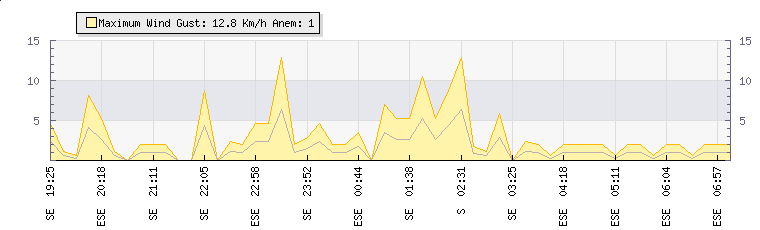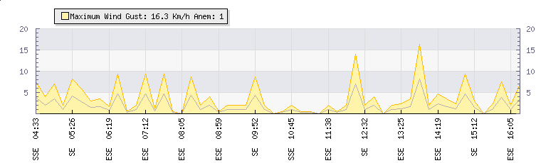 In the last few minutes the wind was East South East at an average speed of 1 kmh, reaching up to 2 kmh and a low of 0 kmh. The gust strength is2 kmh above the minimum speed |