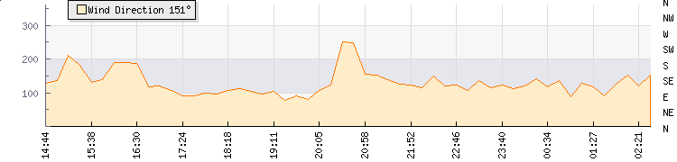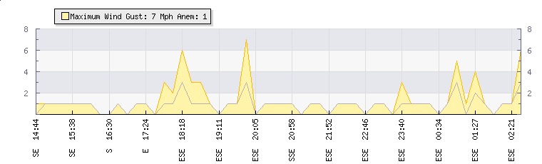 In the last few minutes the wind was East South East at an average speed of 2 mph, reaching up to 4 mph and a low of 0 mph. The gust strength is4 mph above the minimum speed |