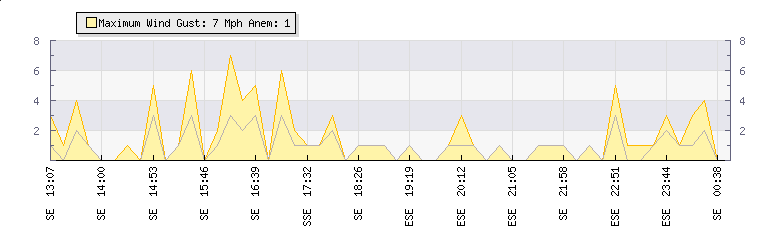 In the last few minutes the wind was South South East at an average speed of 1 mph, reaching up to 1 mph and a low of 0 mph. The gust strength is1 mph above the minimum speed |