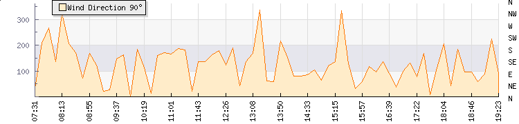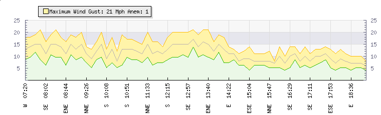 In the last few minutes the wind was South Easterly at an average speed of 12 mph, reaching up to 16 mph and a low of 7 mph. The gust strength is9 mph above the minimum speed |