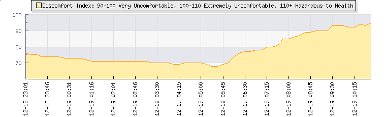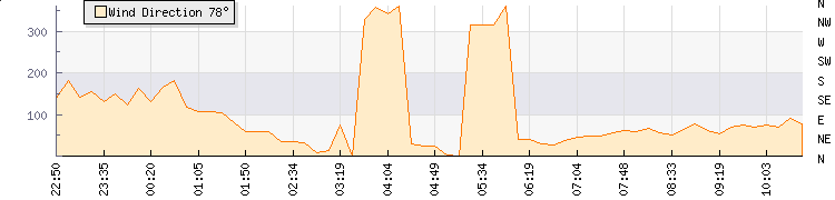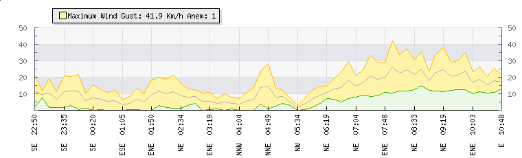 In the last few minutes the wind was East North East at an average speed of 23 kmh, reaching up to 34 kmh and a low of 12 kmh. The gust strength is22 kmh above the minimum speed |