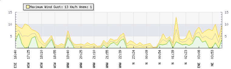 In the last few minutes the wind was East North East at an average speed of 7 kmh, reaching up to 9 kmh and a low of 5 kmh. The gust strength is4 kmh above the minimum speed |