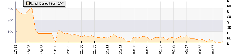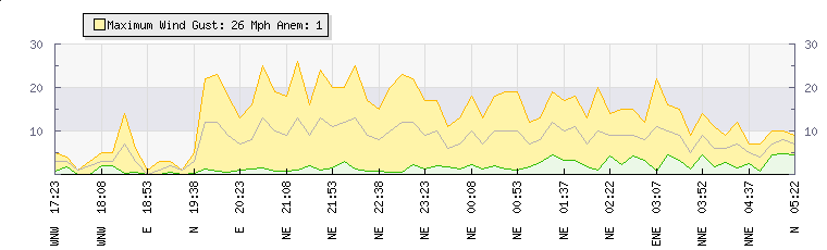 In the last few minutes the wind was North North East at an average speed of 9 mph, reaching up to 14 mph and a low of 5 mph. The gust strength is9 mph above the minimum speed |