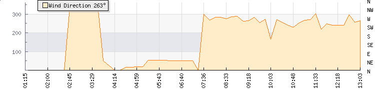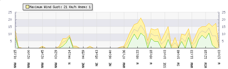 In the last few minutes the wind was South South East at an average speed of 5 kmh, reaching up to 11 kmh and a low of 0 kmh. The gust strength is11 kmh above the minimum speed |