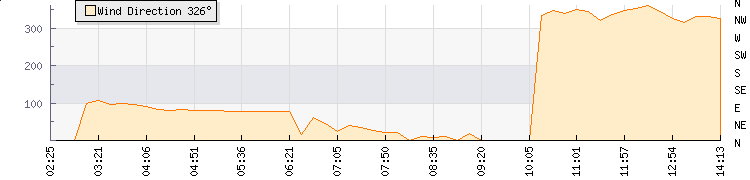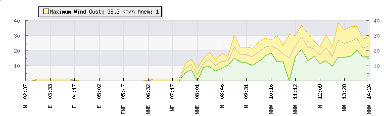 In the last few minutes the wind was North Westerly at an average speed of 27 kmh, reaching up to 38 kmh and a low of 16 kmh. The gust strength is22 kmh above the minimum speed |