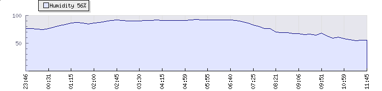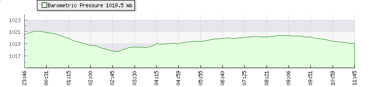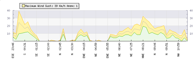 In the last few minutes the wind was North Westerly at an average speed of 11 kmh, reaching up to 13 kmh and a low of 8 kmh. The gust strength is5 kmh above the minimum speed |