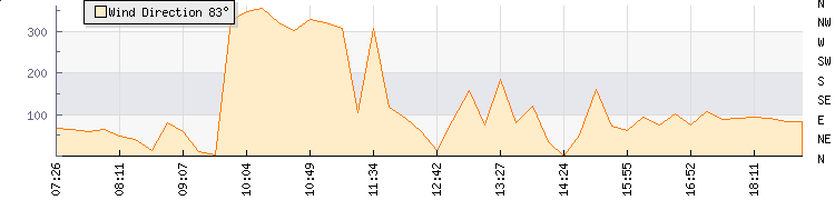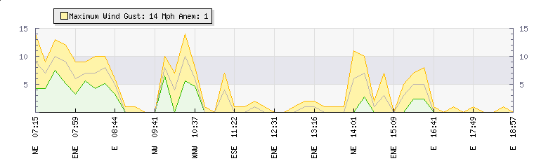 In the last few minutes the wind was Easterly at an average speed of 0 mph, reaching up to 0 mph and a low of 0 mph. The gust strength is0 mph above the minimum speed |